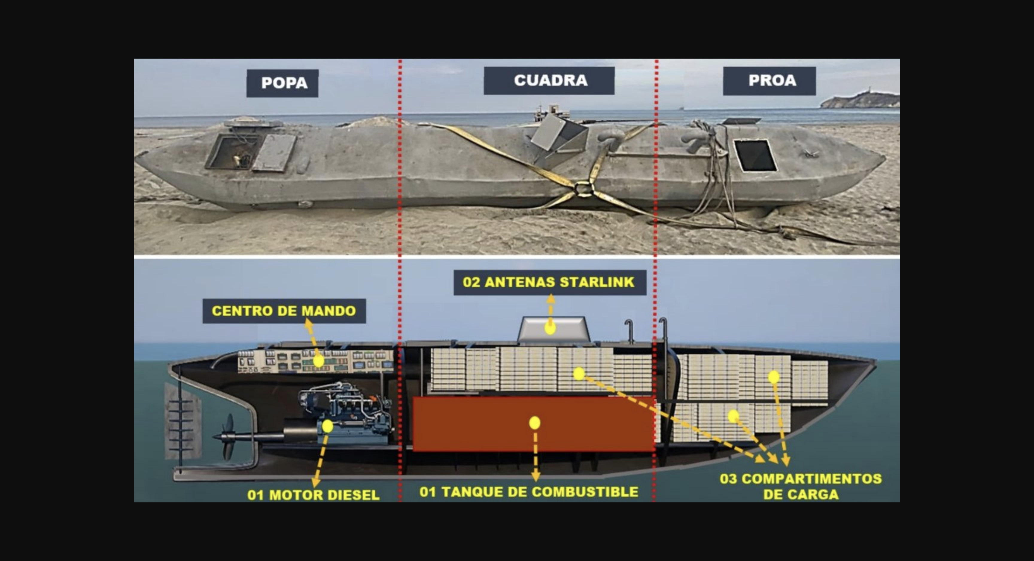 Las diferencias más significativas, como se puede observar en la imagen proporcionada por los investigadores, se encuentran en la parte superior del aparato, donde se encuentran los equipos de piloto automático, situados justo encima de la zona del motor (en una área cercana a la popa), que operan a través de tecnología GPS, asistidos por dos antenas Starlink localizadas en el centro de la embarcación, debajo de la escotilla.
